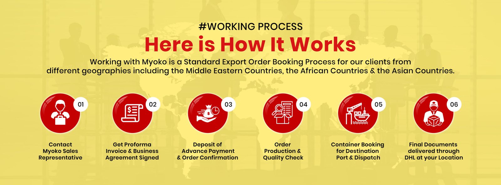 Working with Myoko follows a standard export order booking process designed for clients across different regions, including the Middle East, African countries, and Asian countries.